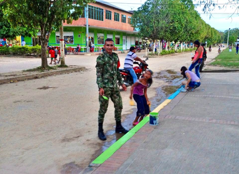 a soldier helps a young girl with the community painting project